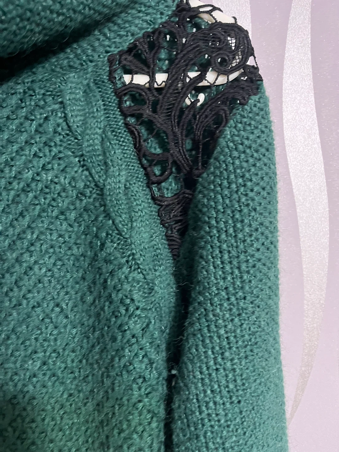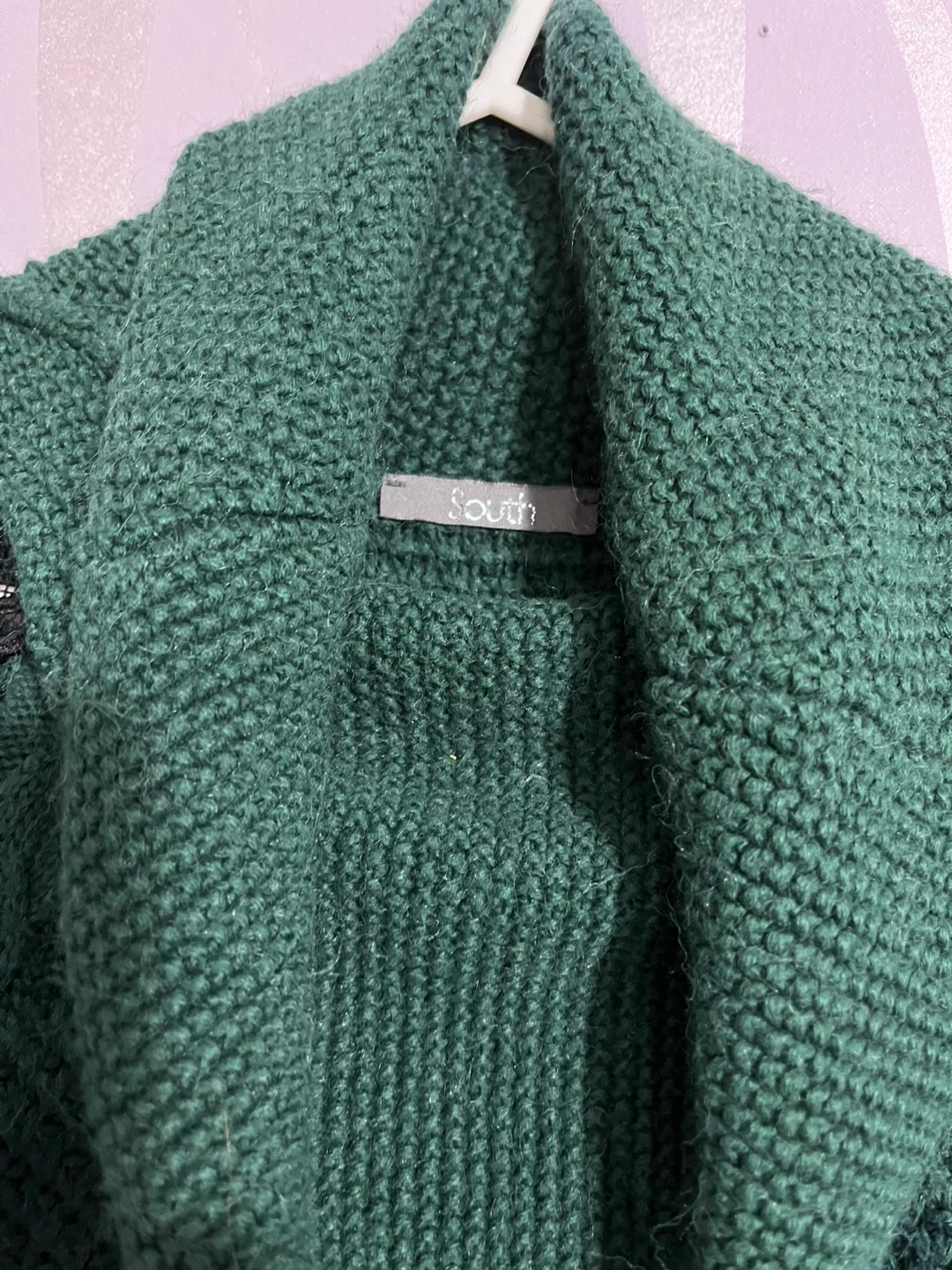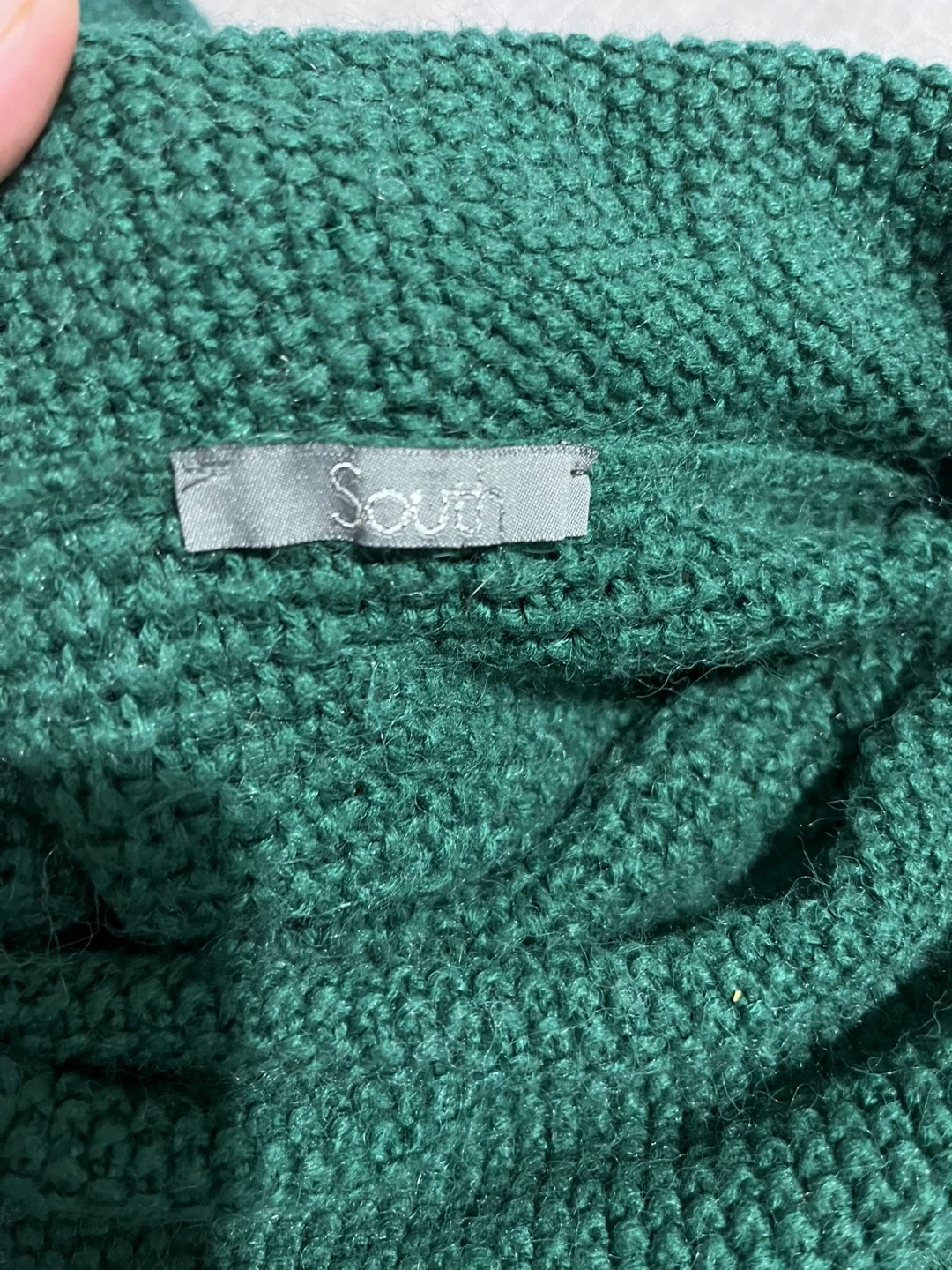 2 reviewsHere's a lovely green knitted jumper from South. It features a stylish shawl collar and pretty black lace detailing on the shoulders. Perfect for layering up on chilly days!