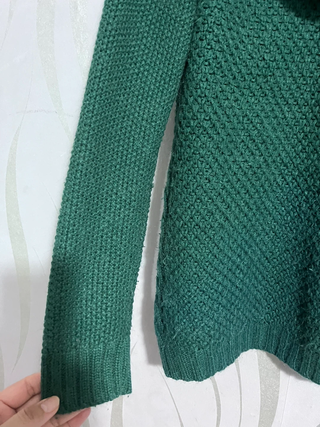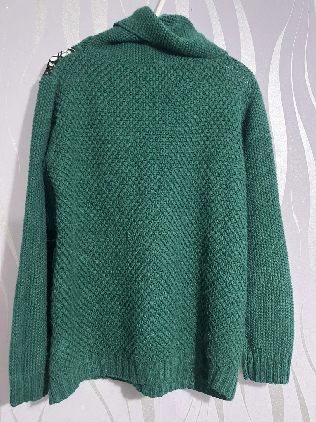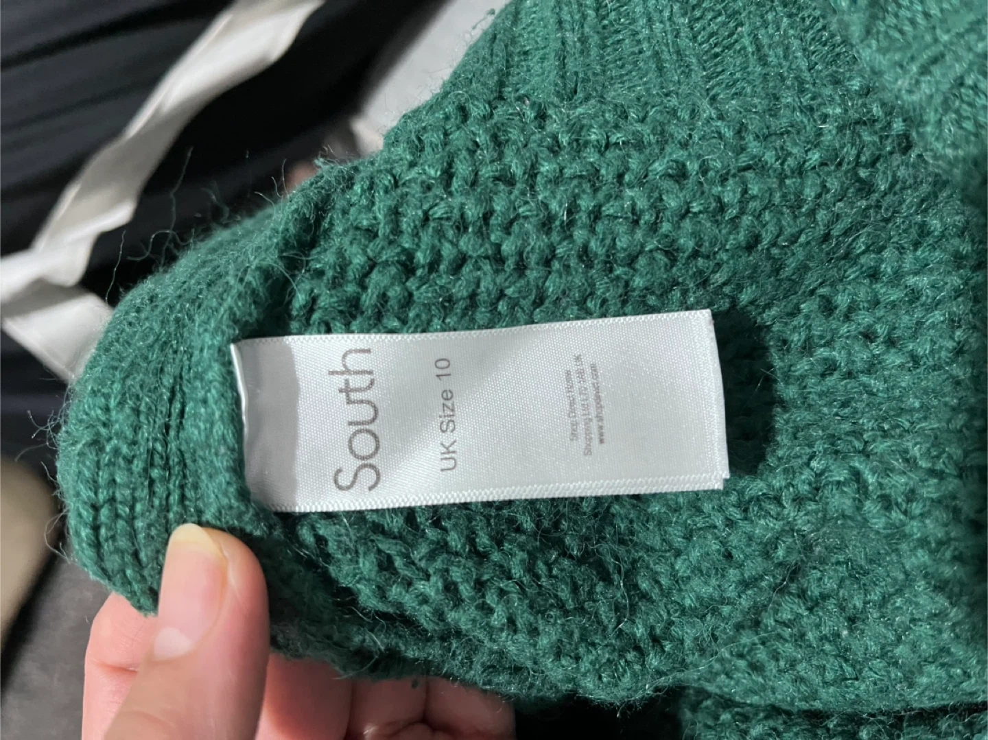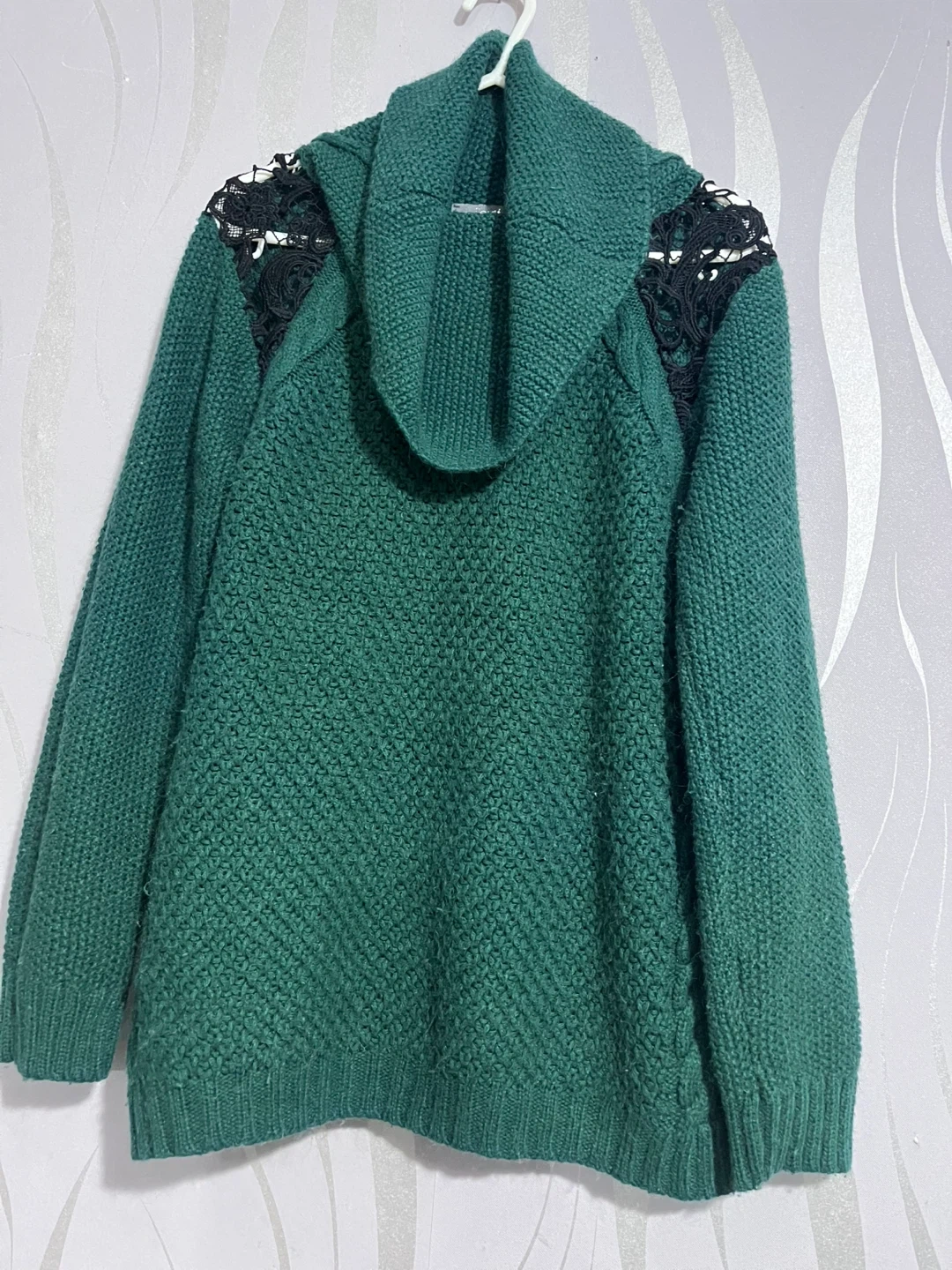 2 reviewsHere's a lovely green knitted jumper from South. It features a stylish shawl collar and pretty black lace detailing on the shoulders. Perfect for layering up on chilly days!