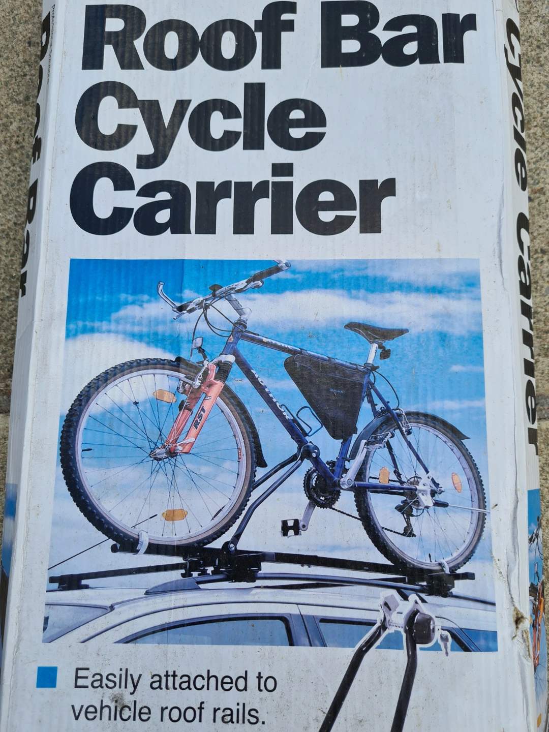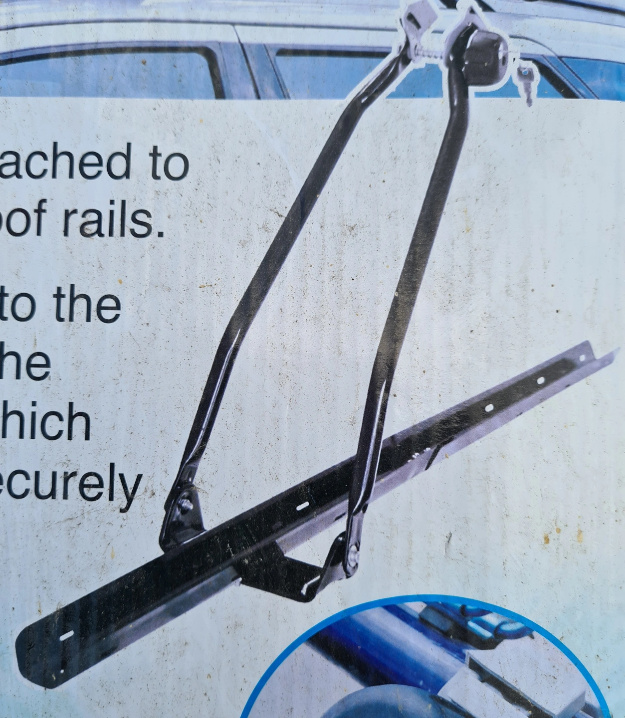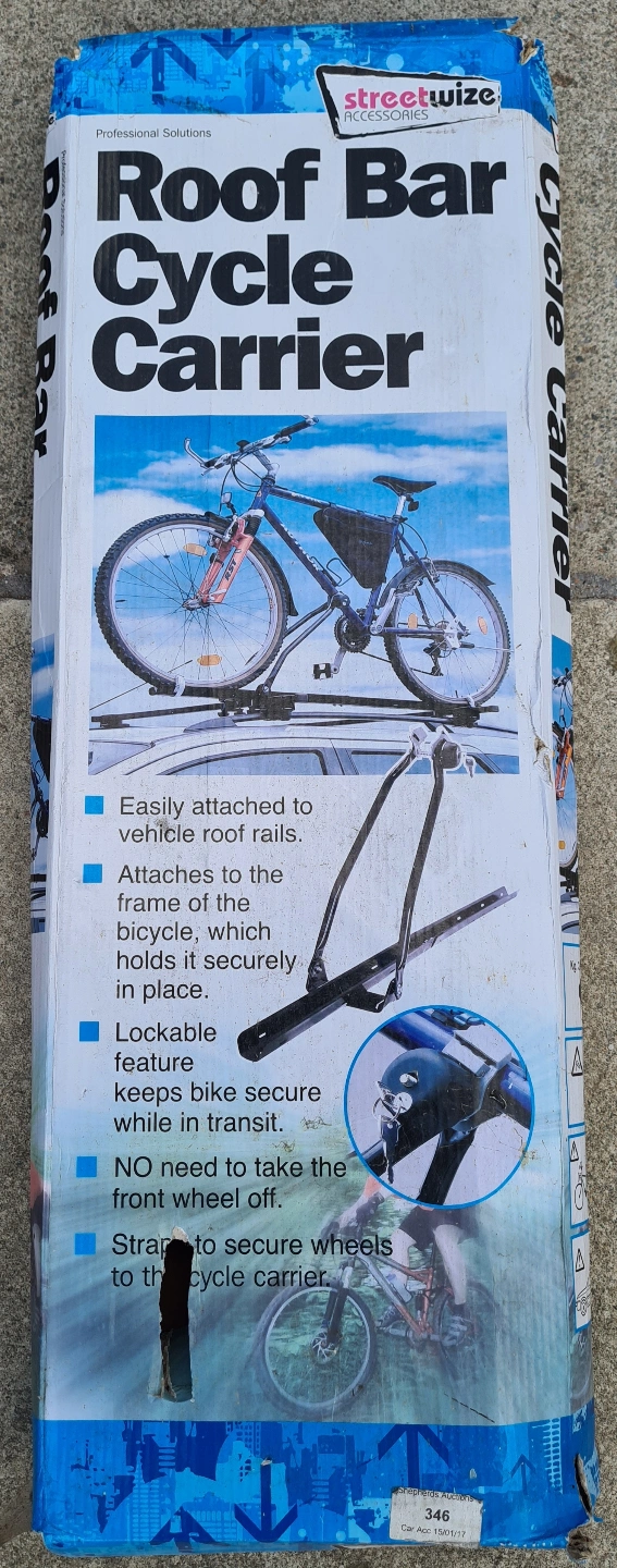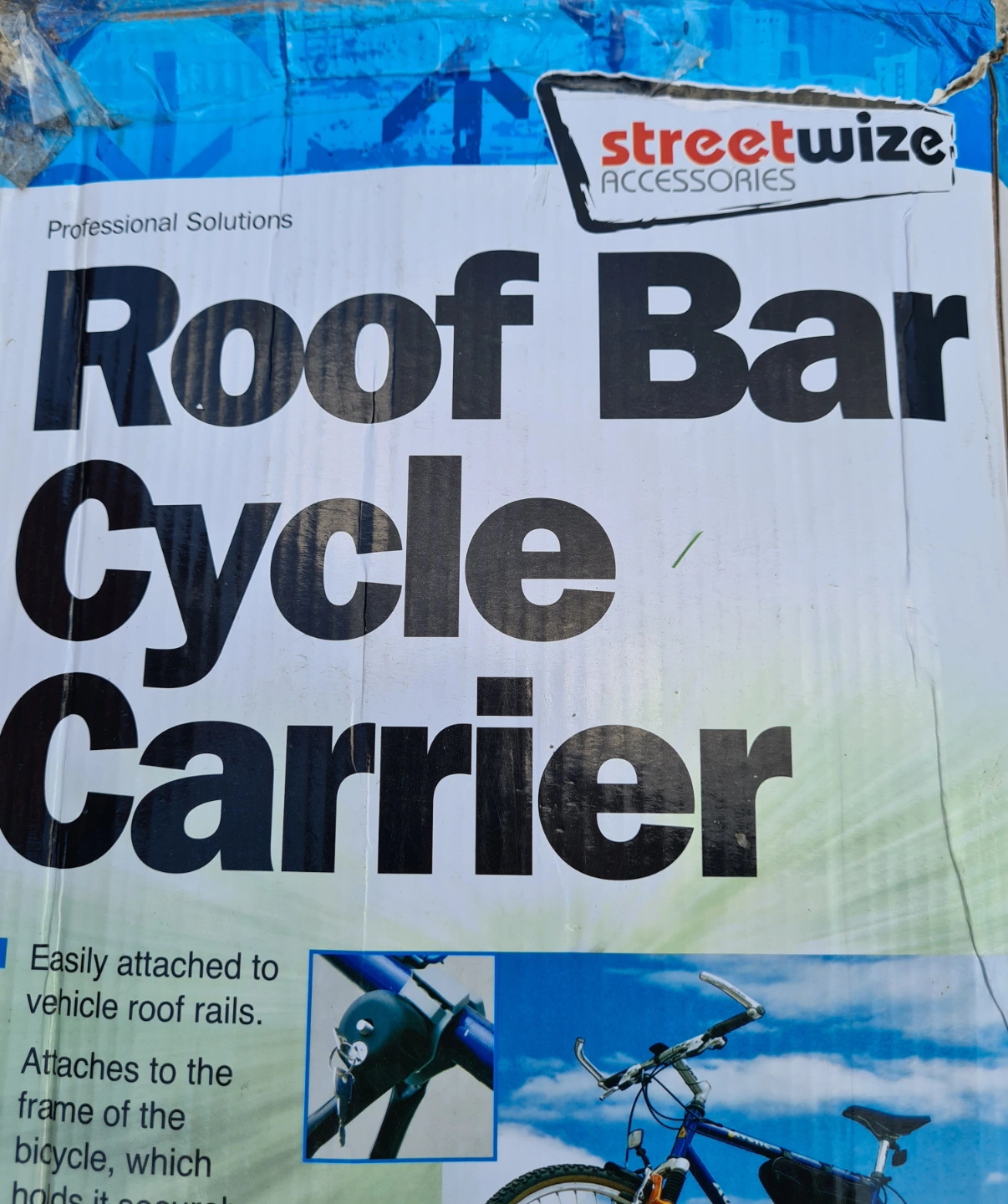 3 reviewsNew Streetwize roof bar cycle carrier. Easily attached to vehicle roof rails. Attaches to bike frame, holding securely. Lockable feature keeps bike secure whilst in transit. No need to remove front wheel. Straps secure wheels to carrier.