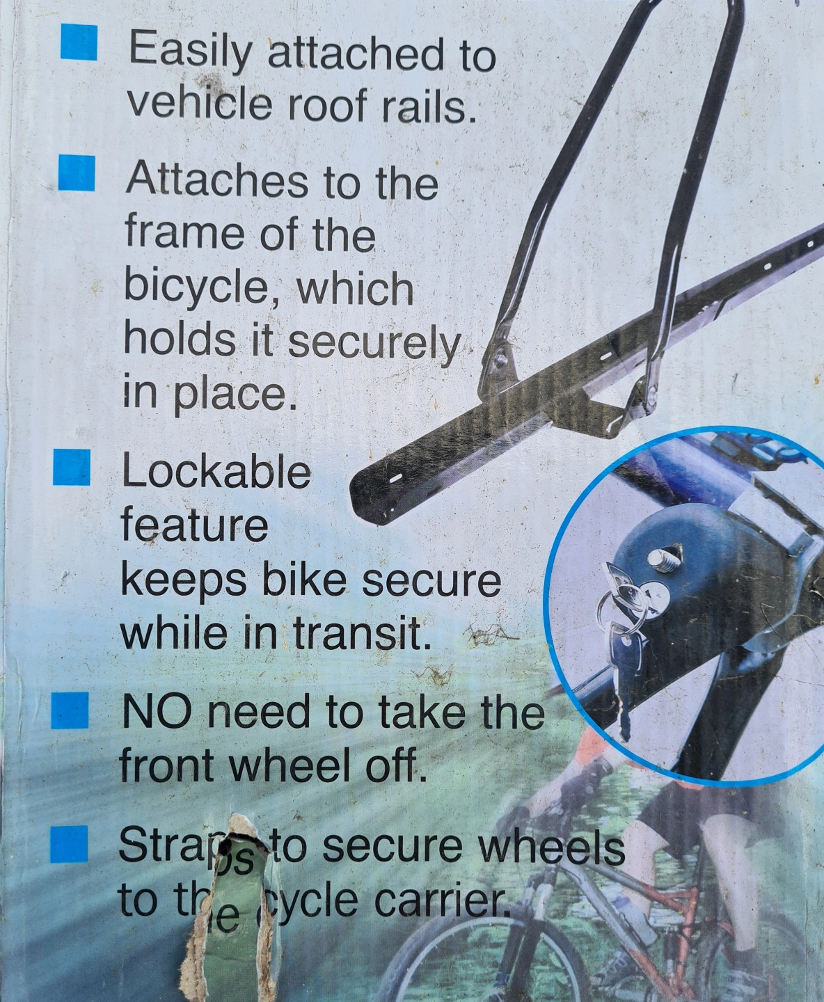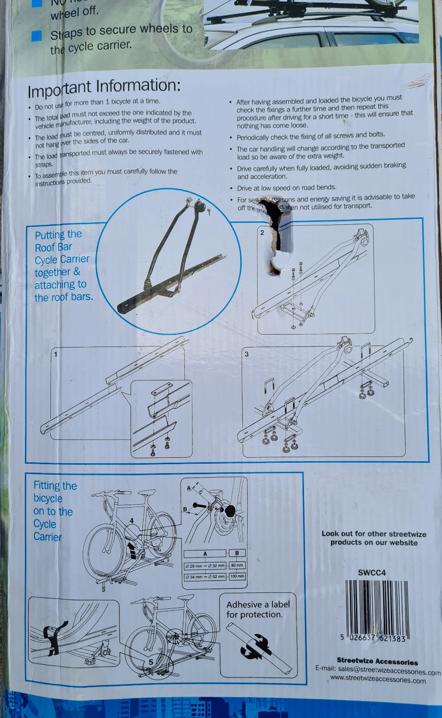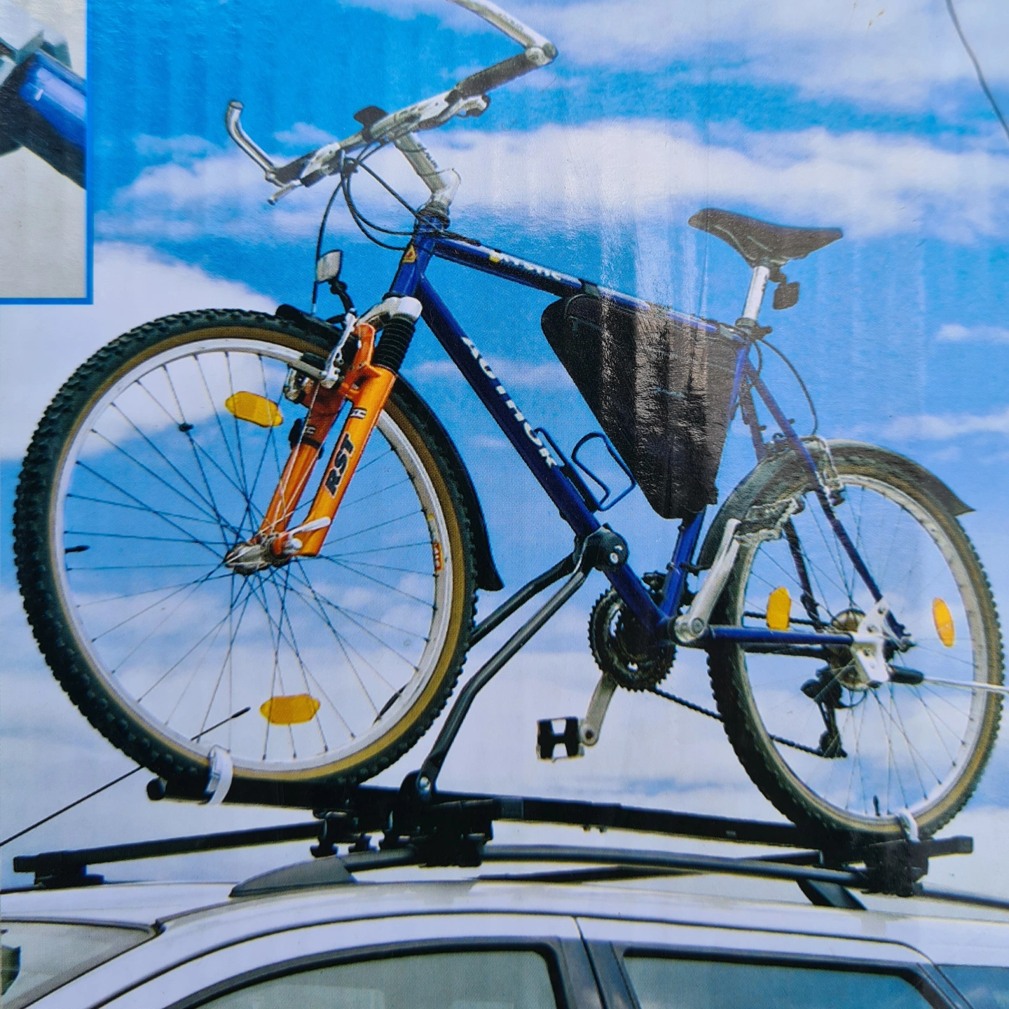 3 reviewsNew Streetwize roof bar cycle carrier. Easily attached to vehicle roof rails. Attaches to bike frame, holding securely. Lockable feature keeps bike secure whilst in transit. No need to remove front wheel. Straps secure wheels to carrier.