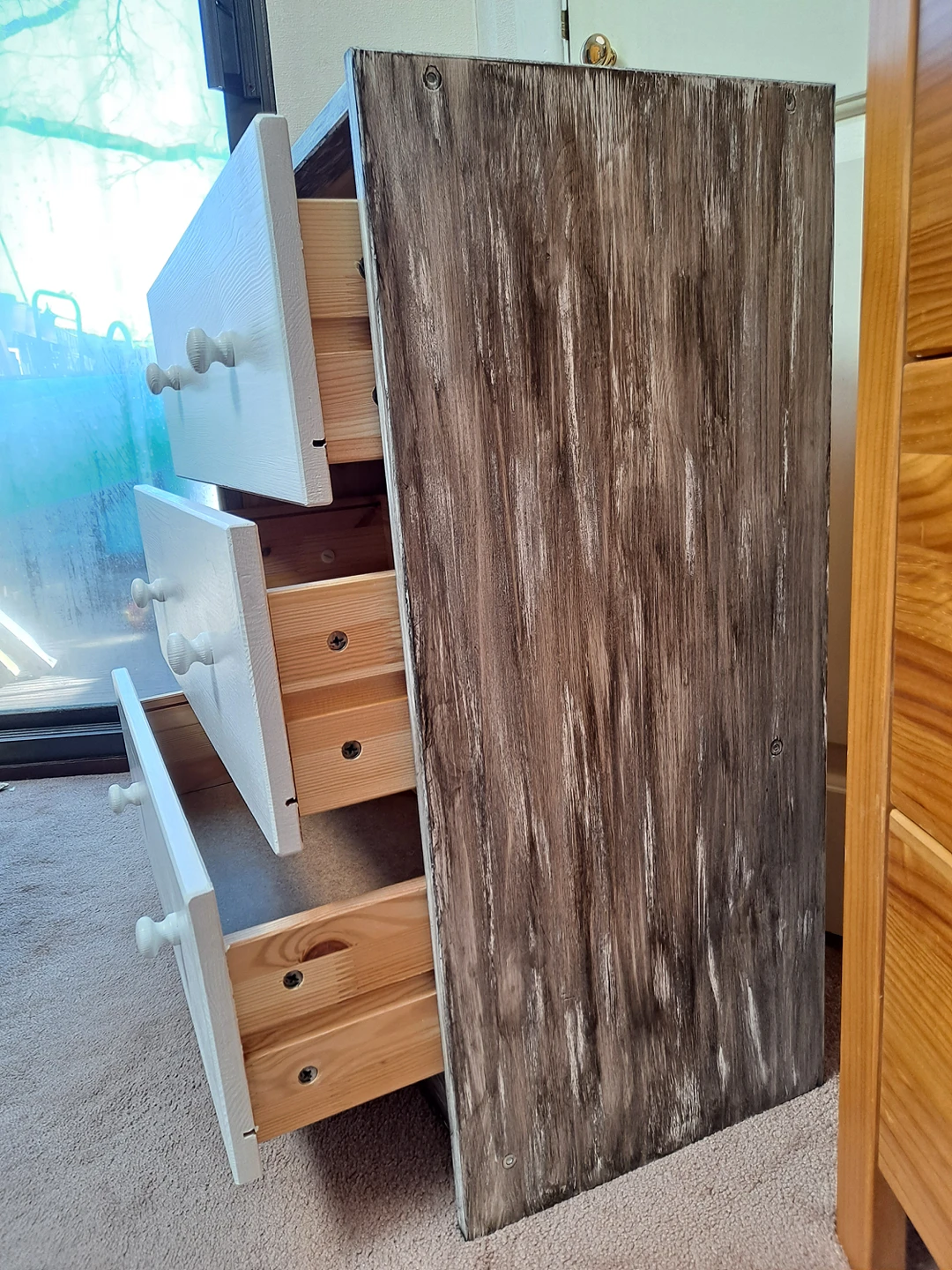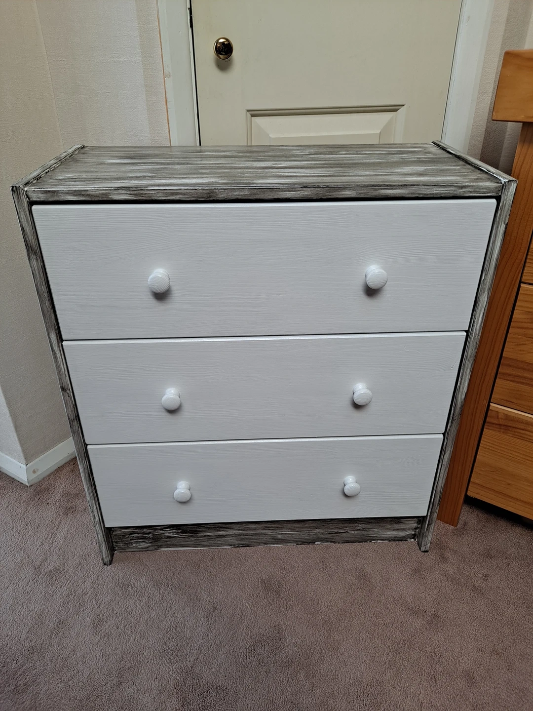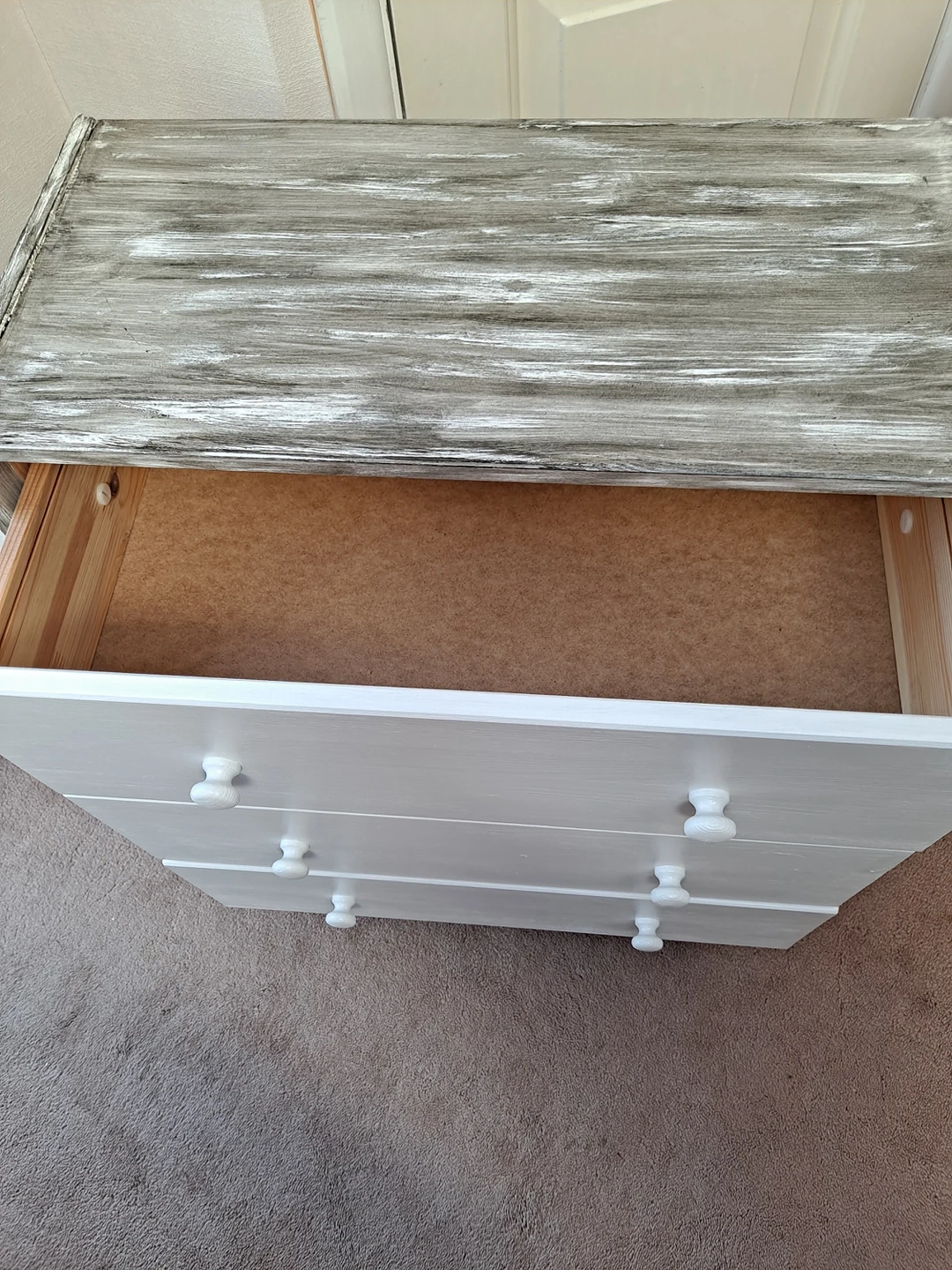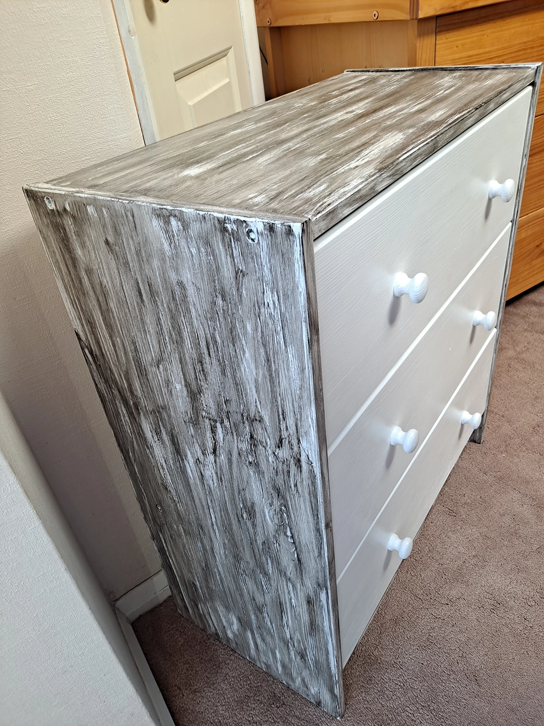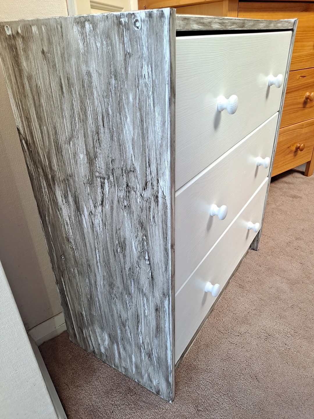 1 reviewSolid pine wood chest of three drawers restored to look like new and one off. Sanded, painted in cotton satin finish Rust Oleum paint with sides decorated to rustic style with Ebony wood stain. Viewing and contactless collection welcome with social distancing in place. Possible local delivery. Dimensions Height 69.5 cm Width 62 cm Depth 30 cm