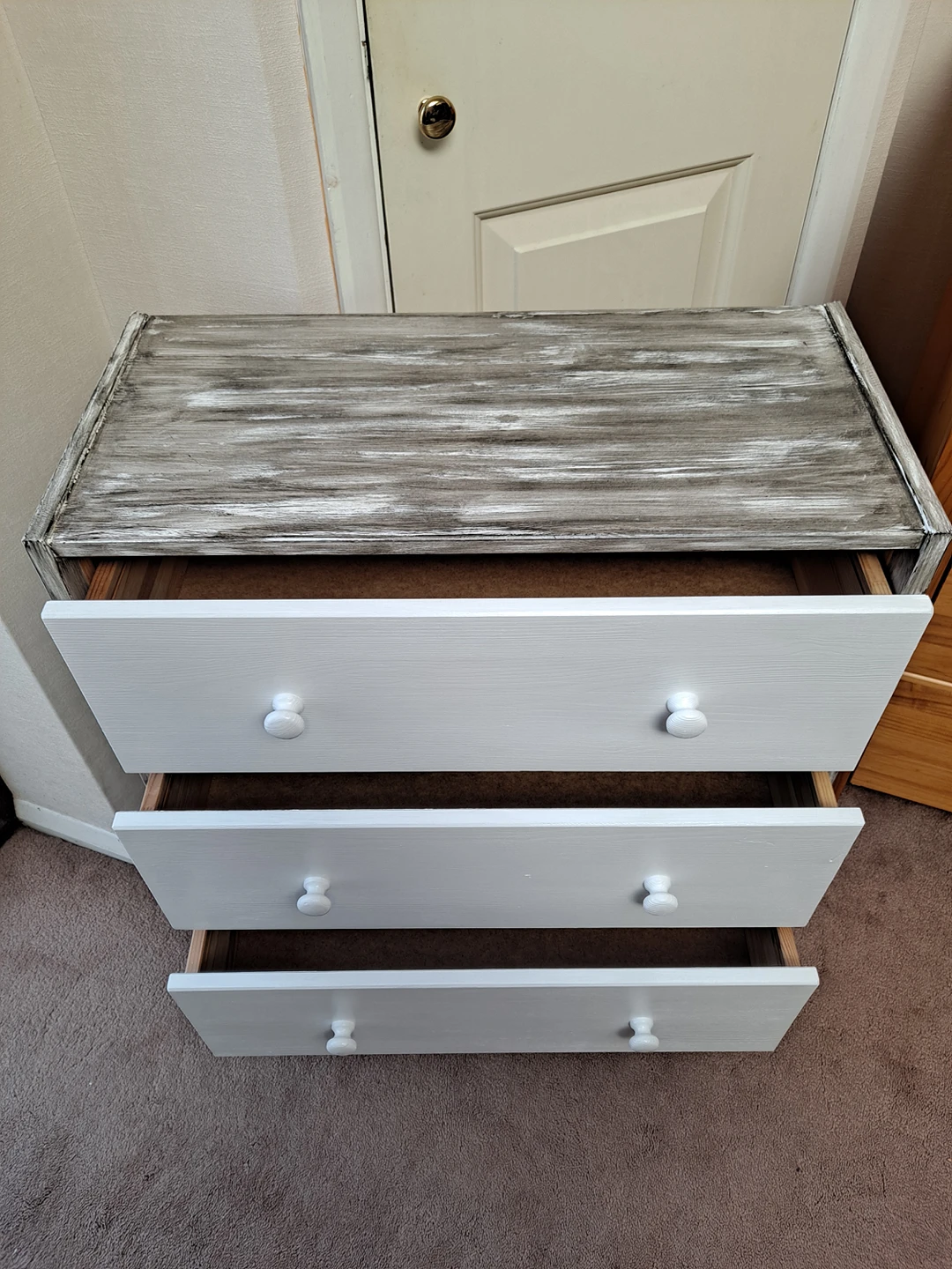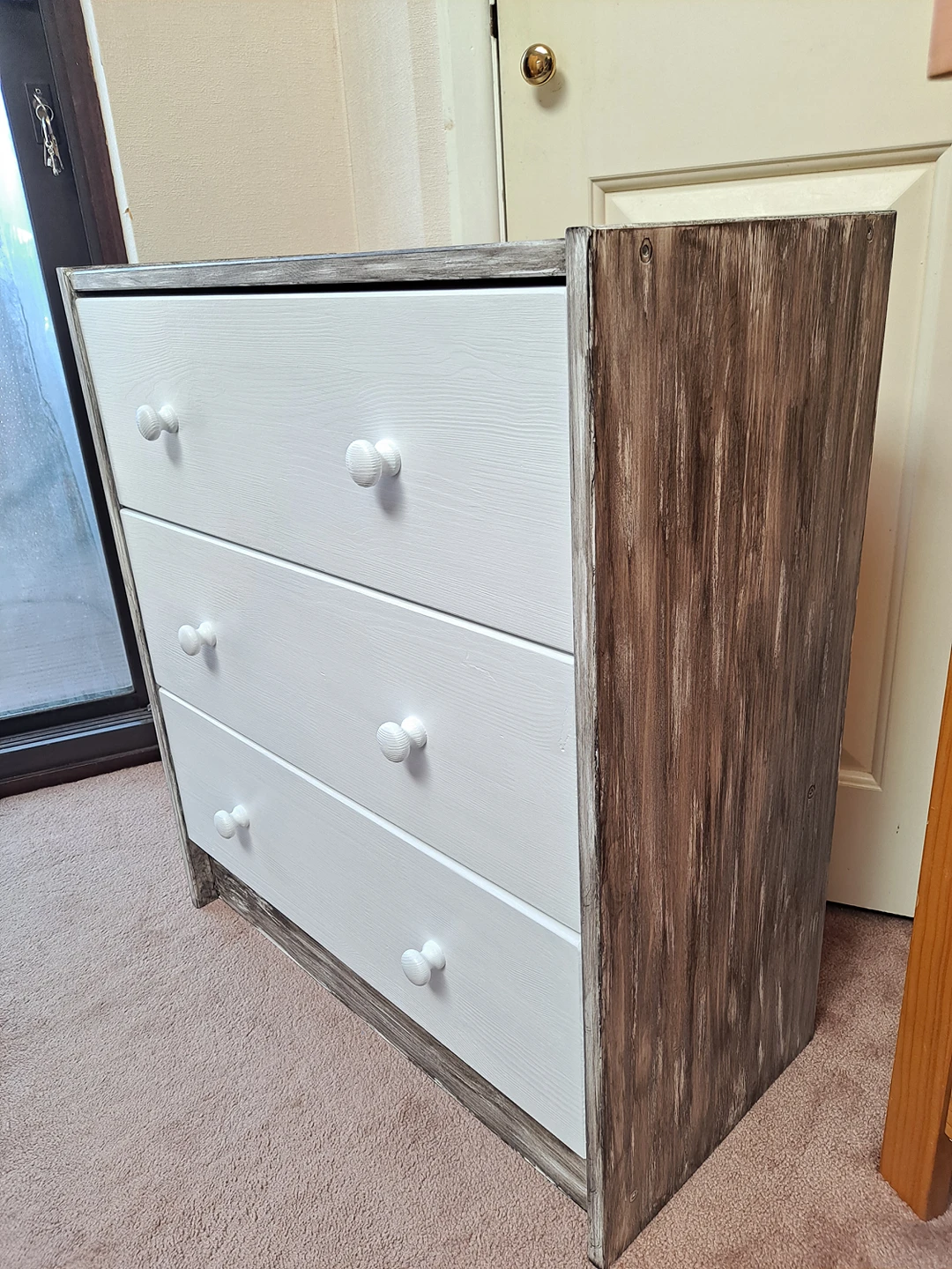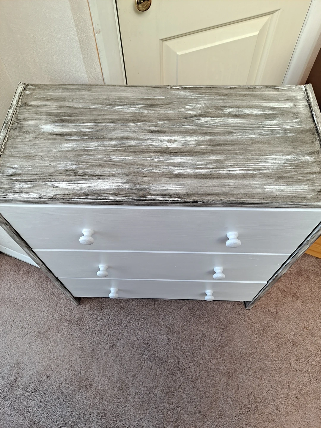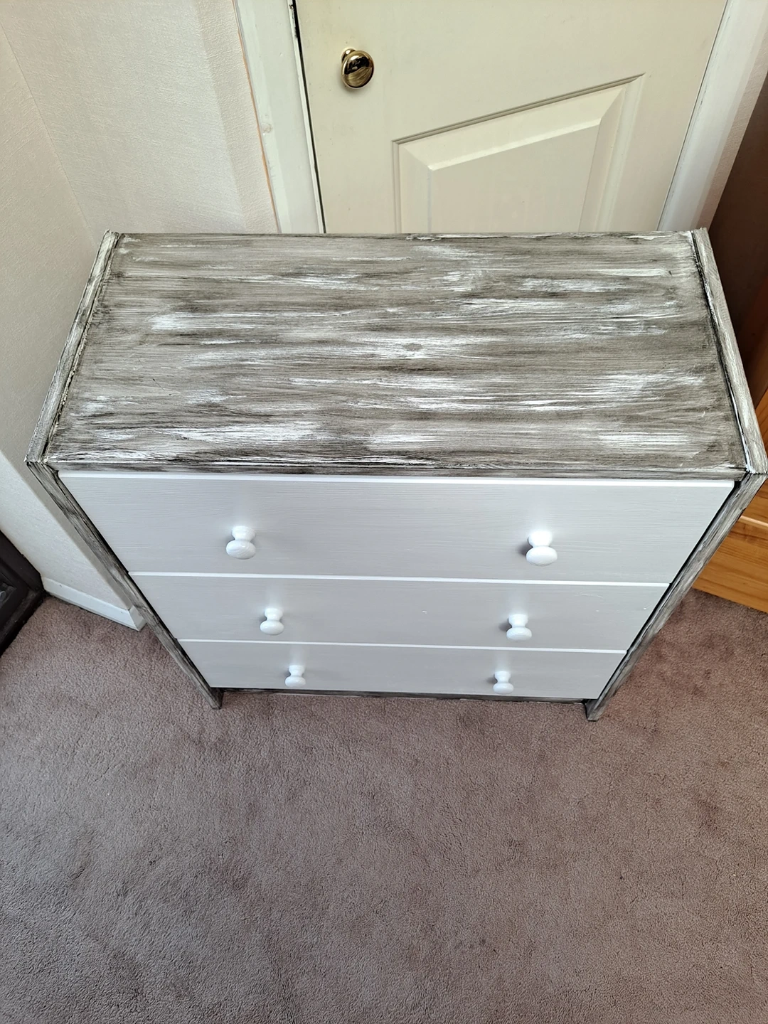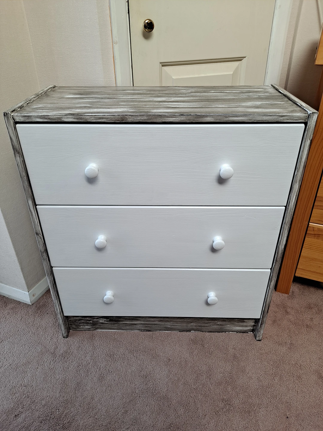 1 reviewSolid pine wood chest of three drawers restored to look like new and one off. Sanded, painted in cotton satin finish Rust Oleum paint with sides decorated to rustic style with Ebony wood stain. Viewing and contactless collection welcome with social distancing in place. Possible local delivery. Dimensions Height 69.5 cm Width 62 cm Depth 30 cm