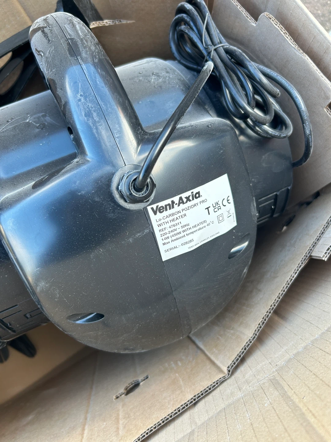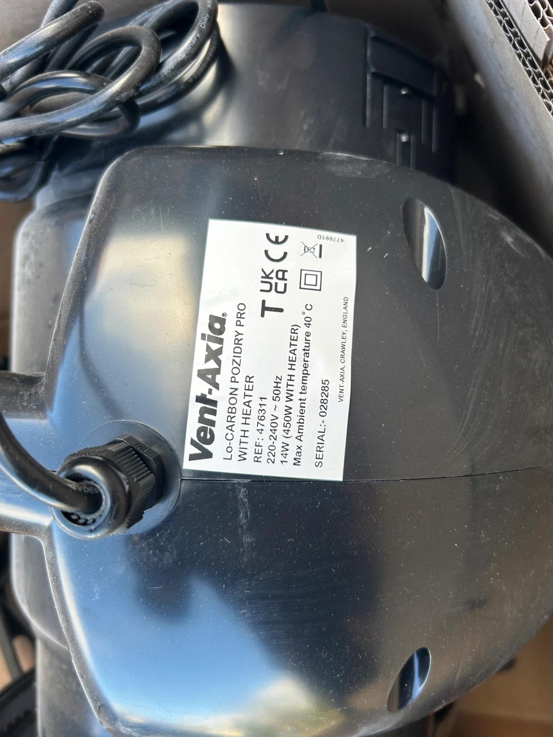 0 reviewsSelling a Vent-Axia Lo-Carbon PoziDry Pro with Heater. It is in its box and appears to be in good condition. Features: - Model: 476311 - Voltage: 220-240V ~ 50Hz - Power: 14W (450W with heater) - Max Ambient Temperature: 40°C