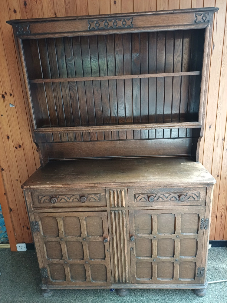 0 reviewsA lovely vintage dark wood dresser with a hutch. It features intricate detailing and offers ample storage space with drawers and cabinets. Perfect for adding a touch of classic charm to your home