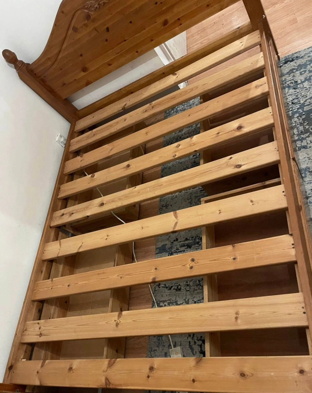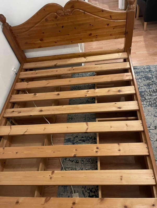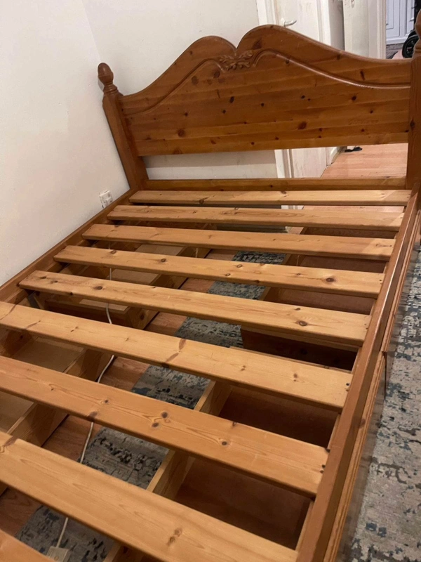 Selling a wooden bed frame. It's in good condition and ready for a new home. Perfect for adding a touch of rustic charm to your bedroom