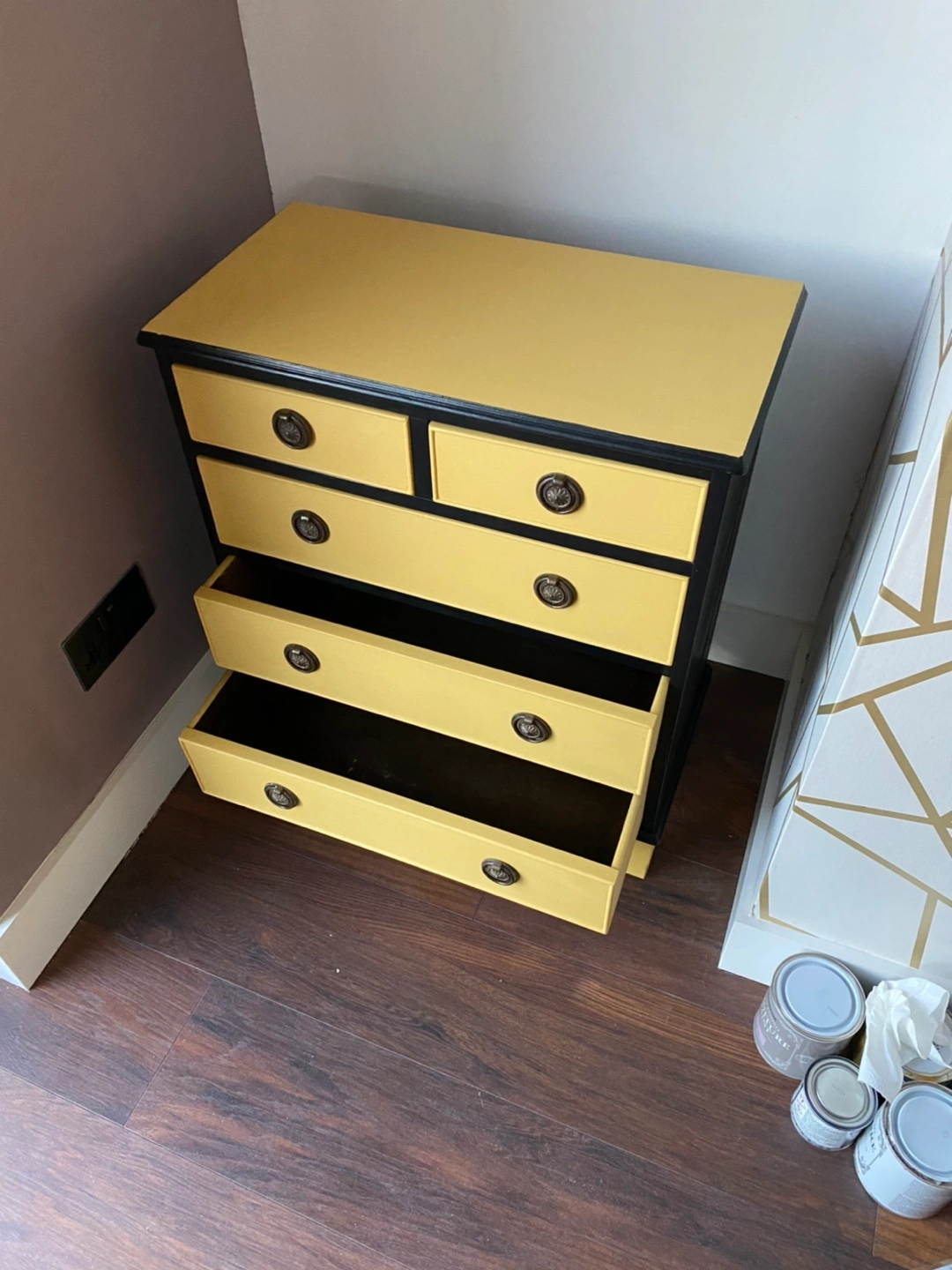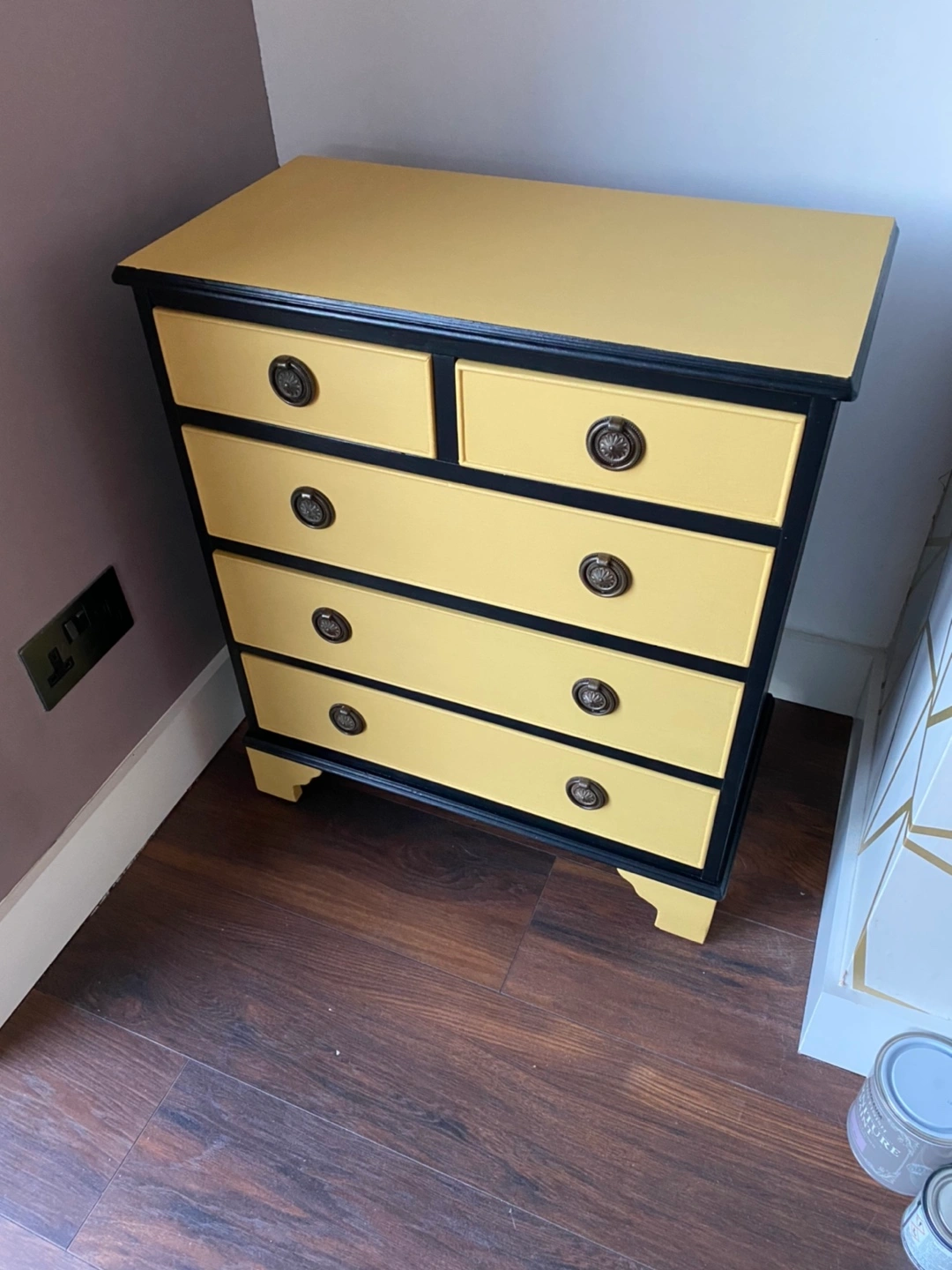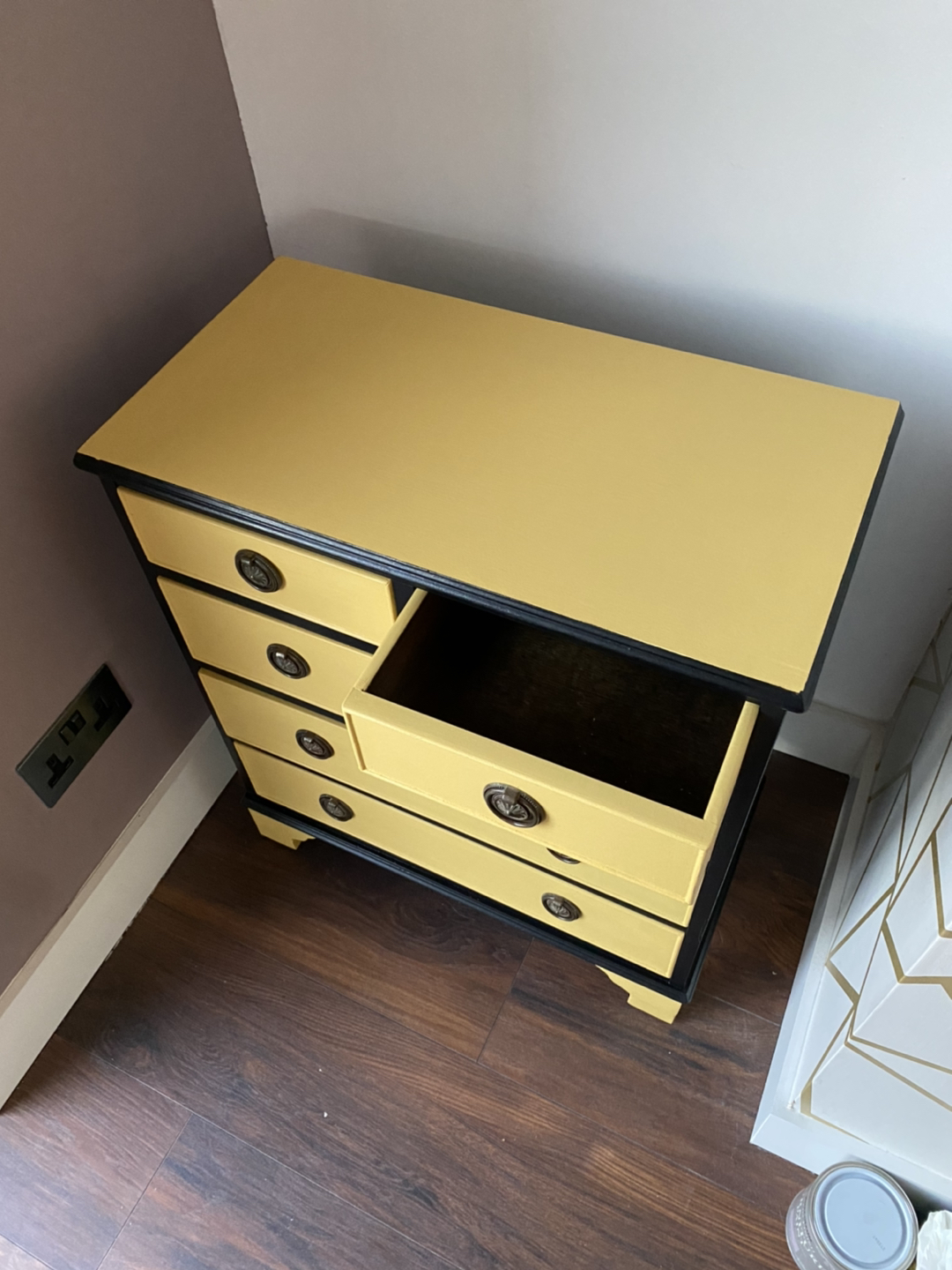 0 reviewsLovely set of solid wood draws, 3 large bottoms draws and 2 smaller top ones. 61cm W x 70cm h x 32cm deep Painted in black and yellow satin with original handles. Lovely price to brighten up your room. Collection in sheffield or Dronfield.