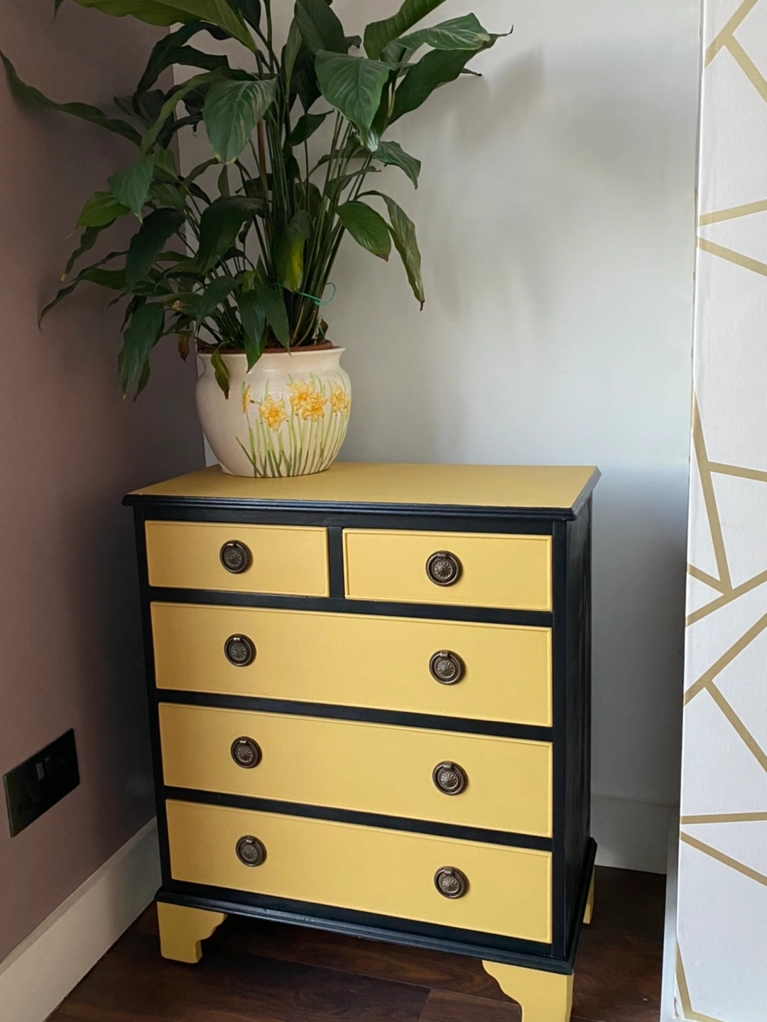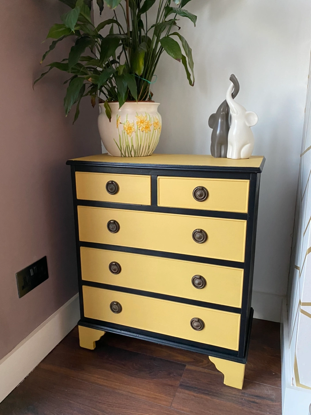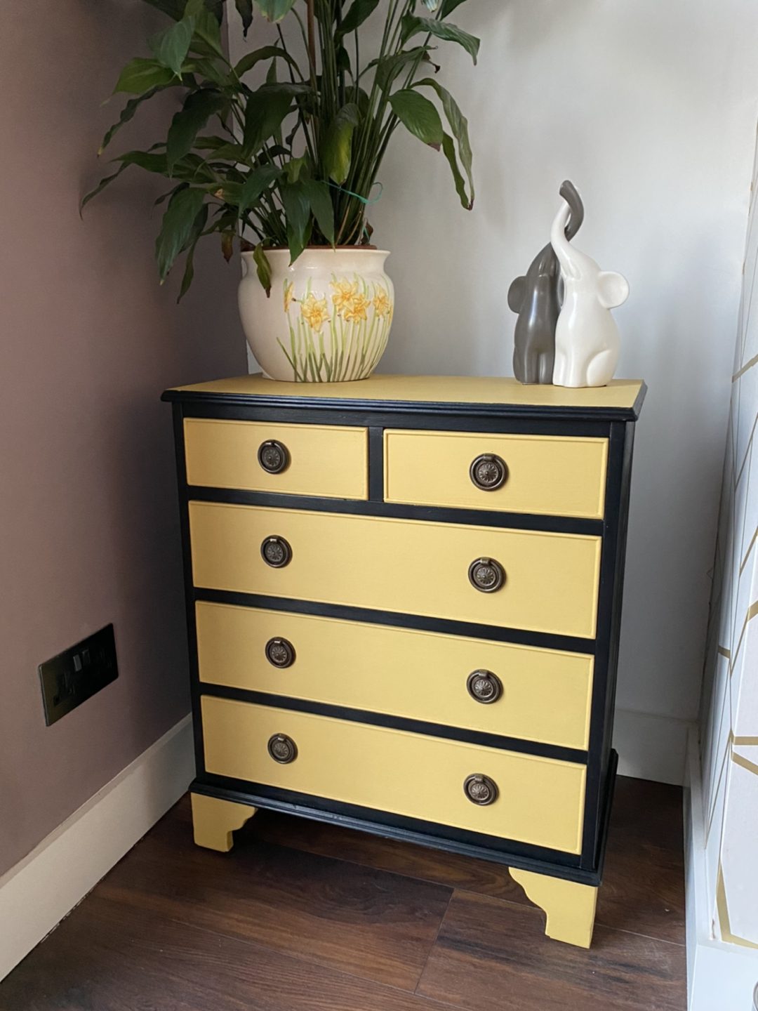 0 reviewsLovely set of solid wood draws, 3 large bottoms draws and 2 smaller top ones. 61cm W x 70cm h x 32cm deep Painted in black and yellow satin with original handles. Lovely price to brighten up your room. Collection in sheffield or Dronfield.